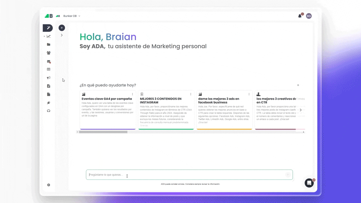 What other platforms don’t offer: ADA AI is not just another generic AI tool for marketing. It’s trained with your own data, inside your Bunker DB ecosystem. No external integrations, no technical setup, no complex onboarding. ADA AI is more than an AI marketing tool—it’s your new always-on analyst, with full access to your connected data.