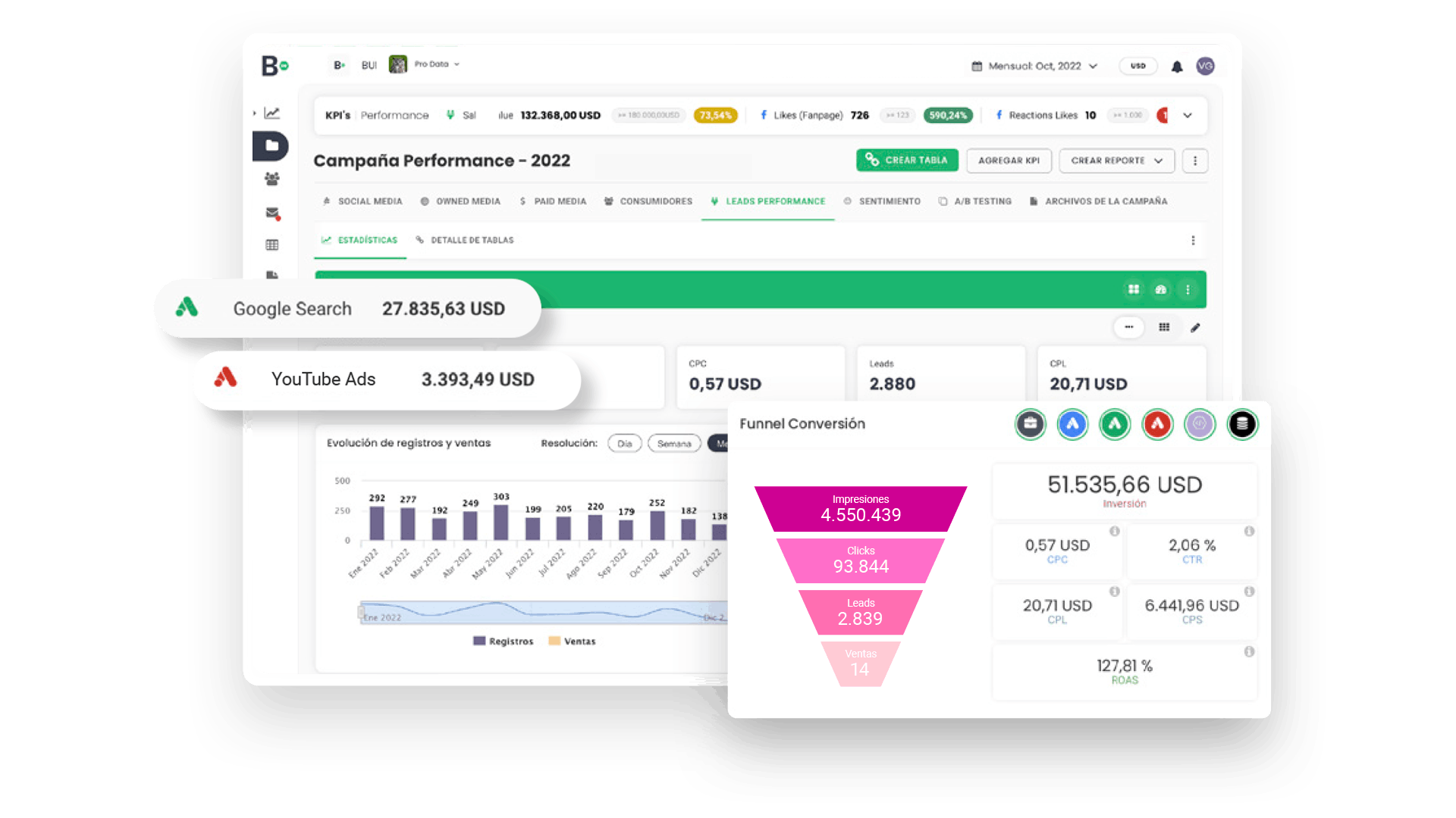 Analiza la calidad y evolución de tus leads, desde la generación hasta la conversión. Con Lead Performance, centraliza y evalúa todo tu lead generation data en un solo panel. Haz lead analysis en tiempo real y entiende qué fuentes generan contactos de valor y ventas para tu marca.