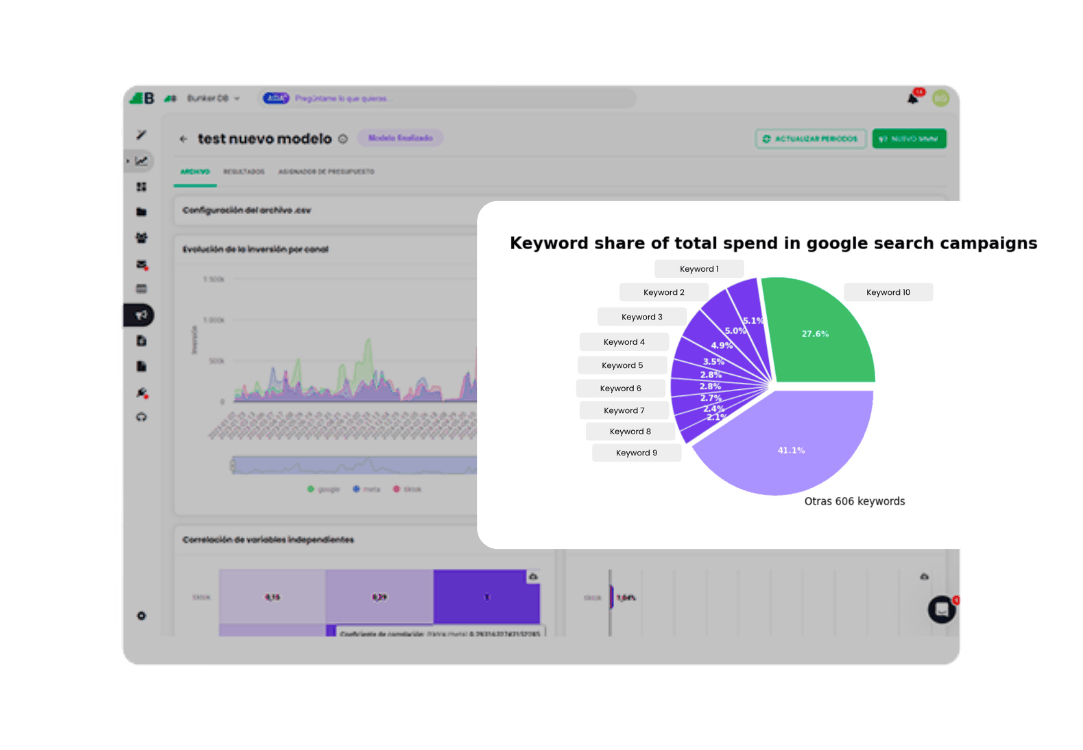 Evalúa las keywords que concentraron la mayor parte de la inversión en campañas de búsqueda en Google Ads, detectando posibles oportunidades de redistribución estratégica.
