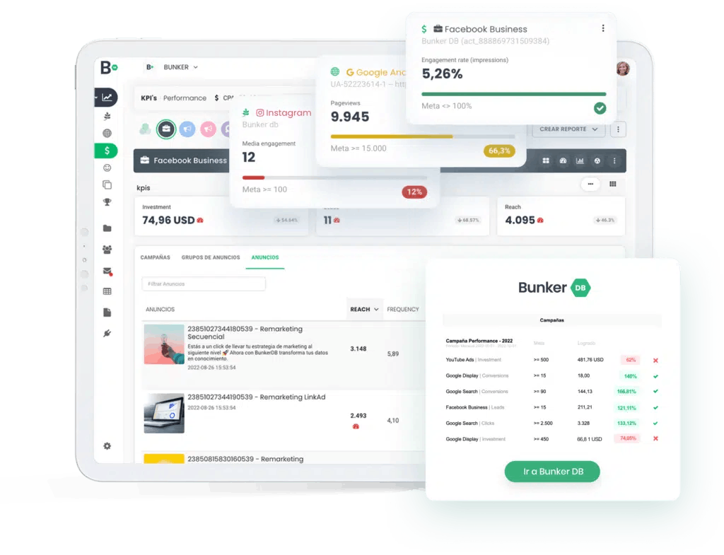 Mientras otras herramientas solo permiten visualizar métricas, Bunker DB convierte esos datos en acción inmediata. Este módulo se integra con todo el ecosistema: campañas, dashboards y reportes, para que puedas actuar en tiempo real. Alertas & KPI no es solo control de métricas: es tu sistema de anticipación para decisiones más rápidas y acertadas.