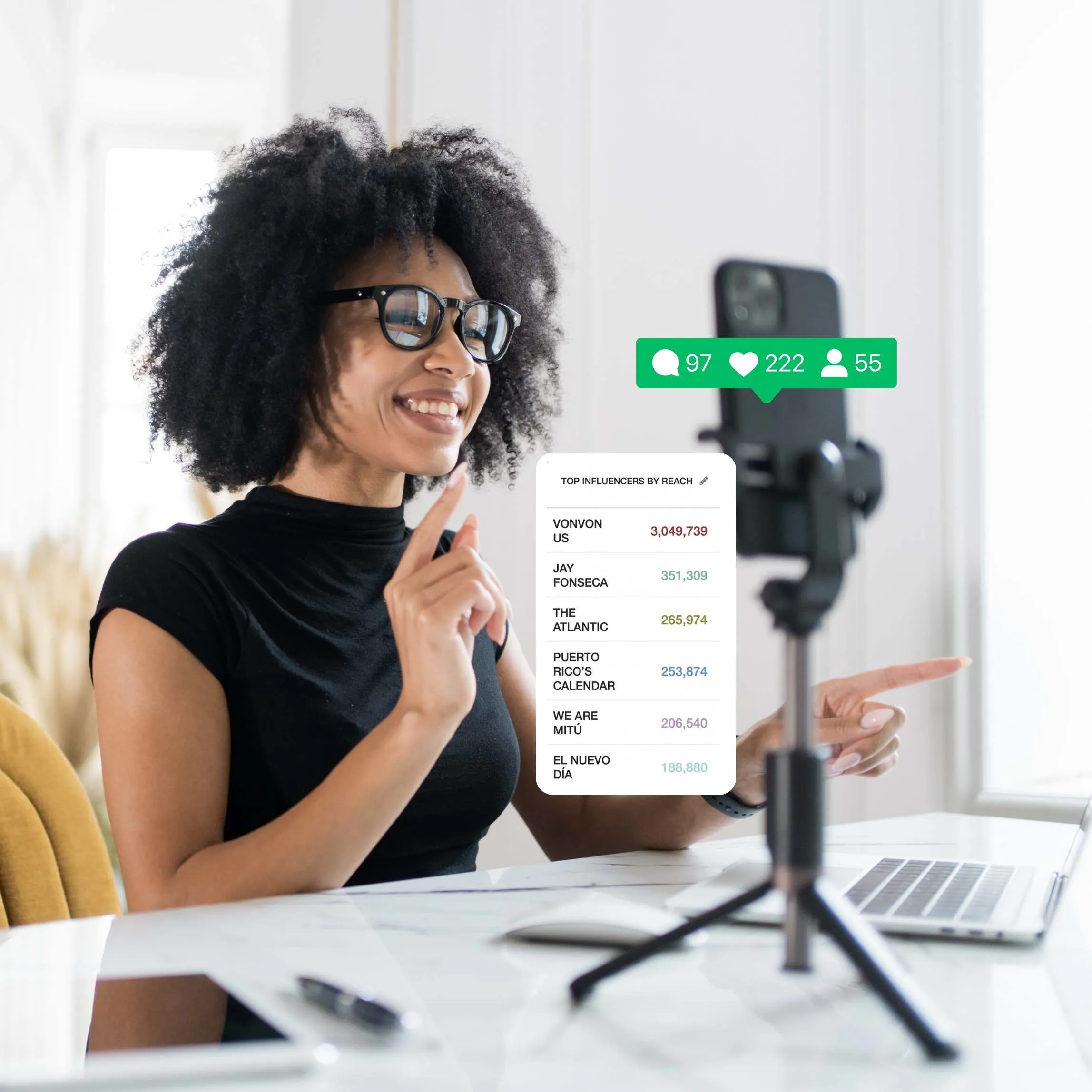 Conoce quiénes hablan de tu marca, qué tan influyentes son y qué alcance generan. Visualiza métricas clave como engagement rate, país de origen, menciones, interacciones y otros datos esenciales para evaluar impacto y tomar mejores decisiones.
