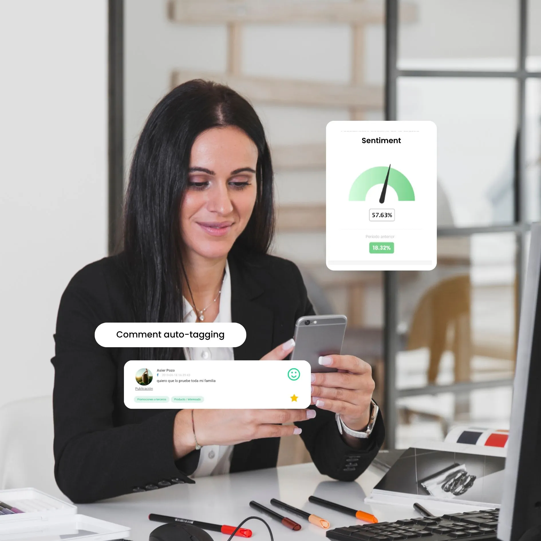 Nuestra solución de sentiment analysis y gestión de comunidades ayuda a equipos de marketing a administrar conversaciones desde un panel. IA integrada en el módulo de Sentiment para procesar y analizar automáticamente interacciones digitales, detectar insights y responder más rápido.