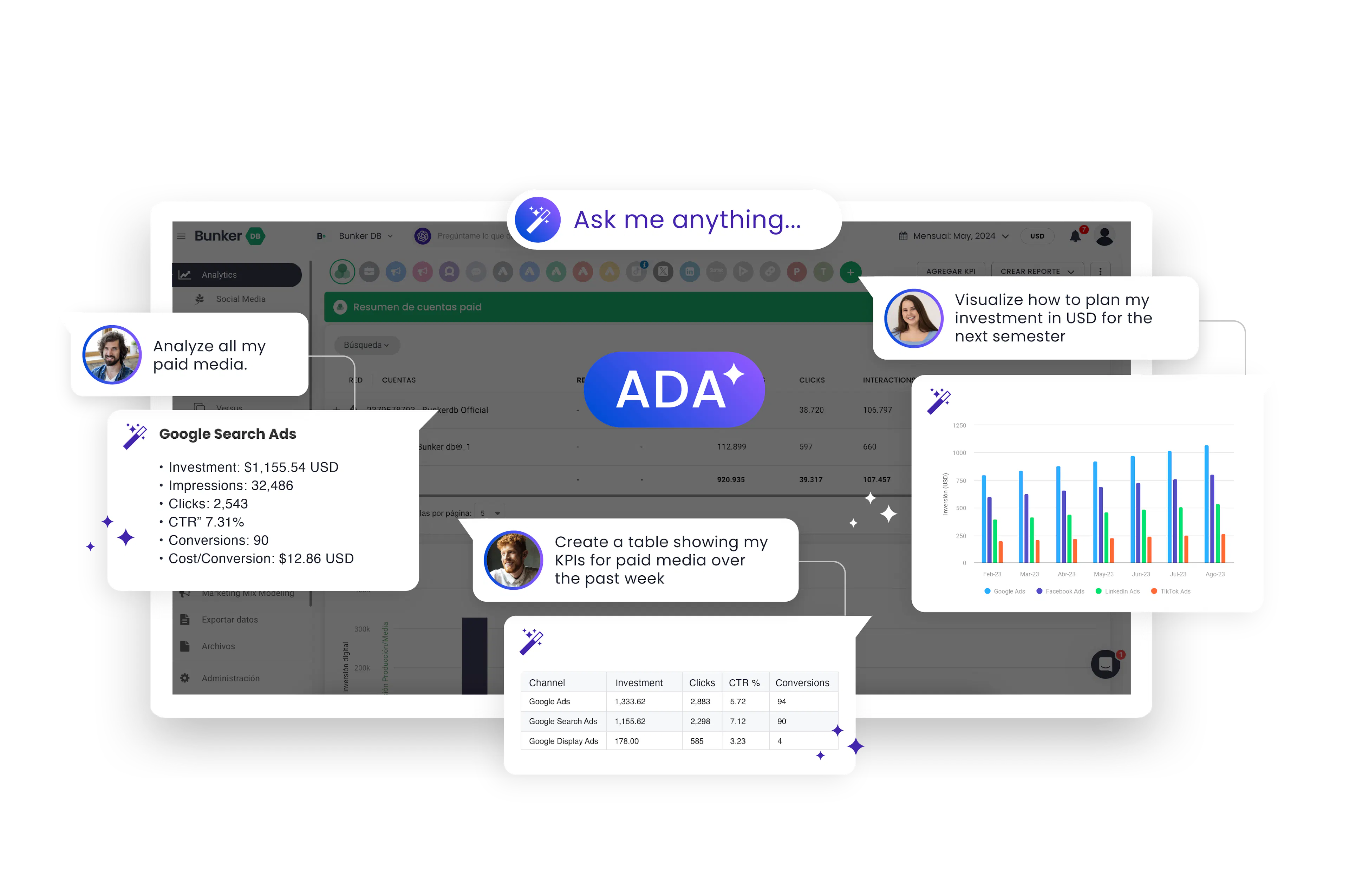 Un prompt es una instrucción o texto inicial que se le proporciona a una herramienta de IA generativa para guiar su generación de respuestas o resultados, según los formatos en los que se especialice la herramienta. Es la instrucción que nos permite hacernos comprender frente a la IA para generar respuestas que tengan valor para nosotros. Es clave saber indicar tu necesidad correctamente a una IA, ya que incrementa la precisión de las respuestas y optimiza el tiempo y los recursos. ADA, nuestra tecnología de IA generativa Hace unas semanas lanzamos ADA dentro de nuestra plataforma, una integración que utilizando la potencia de la inteligencia artificial generativa, específicamente el modelo de lenguaje Chat GPT, puede brindar respuestas a preguntas, consultas y dudas relacionadas con marketing. Al mismo tiempo puede relacionar estas consultas (con previo permiso del usuario) con la información de las distintas cuentas que estén conectadas a Bunker DB. Lo que distingue a ADA es su capacidad para ofrecer know-how técnico y especializado en marketing. Puede proporcionar sugerencias y recomendaciones para abordar problemáticas específicas en el ámbito del marketing, lo que la convierte en una herramienta valiosa para profesionales y equipos de marketing que buscan optimizar sus estrategias y campañas. Dominando el arte de promptear para hacer nuestro día a día más efectivo Promptear sin una estructura clara a menudo resulta en respuestas vagas, incompletas o fuera de contexto. Por ello, la claridad y el contexto proporcionados por un prompt bien formulado son importantes para guiar a la IA hacia respuestas detalladas y pertinentes, abarcando desde análisis profundos hasta la generación de insights innovadores. Saber cómo promptear correctamente es fundamental para maximizar la utilidad de las IA. Aquí te damos algunos consejos para crear mejores prompts: Incluye detalles y contexto. Si no eres claro con las instrucciones que le das al chat, estarás dejando que el modelo asuma o adivine lo que quieres decir. Te ponemos un ejemplo: «Necesito comprender la performance de mis campañas de este mes…», «Quiero entender cómo fueron evolucionando los distintos canales que forman parte de mi estrategia de marketing durante este año (2024)…» Pídele un paso a paso. Para algunas tareas más complejas es importante que le des una secuencia de pasos a seguir. Esto facilitará el trabajado del modelo y hará que la respuesta sea más acertada. Te ponemos un ejemplo: «Haz una tabla comparativa detallando en las columnas: 1. nombre de la campaña, 2. métrica CTR, 3. métrica conversiones…» Detalla formatos y otros accionables. Es importante darle información sobre de qué forma quieres recibir estos datos que necesitas, qué más precisas hacer con estos datos o si tienes algún objetivo particular. Recuerda que cuantos más detalles le des a la herramienta, mejor responderá. Por ejemplo: «arroja estos datos en un gráfico que contenga los nombres de las campañas en el eje horizontal y las métrica CTR en el eje vertical…», «Haz un análisis breve con una conclusión que determine que campañas debería despriorizar y cuáles debería escalar…» #Prompt 1: Comparación de campañas en períodos específicos Analizar la comparación entre períodos para luego bajarlo a un reporte y extraer insights valiosos puede llegar a ser una tarea larga y tediosa. Pero si dejas que la tecnología lo haga por ti, ahorrarás tiempo valioso para poder centrarte en otros temas. ¡Hola ADA! Poniéndote en el rol de una analista de datos ¿Puedes hacer un análisis comparativo 2024 vs 2023 tomando las campañas que en su nomenclatura contienen «COR» o «Search» o «Display» en Google ads? Haz una tabla comparativa detallando en las columnas: 1. período (2023 o 2024)